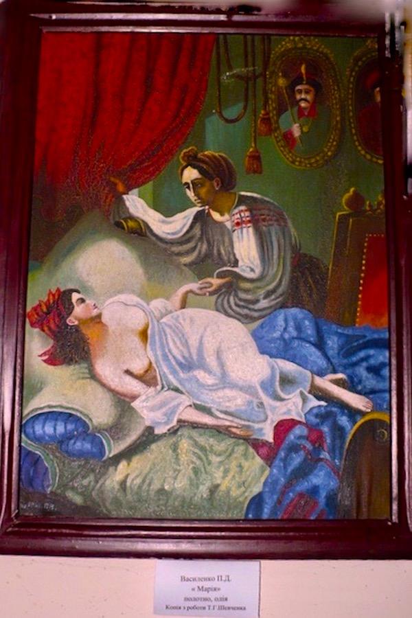 Under the guidance of director Larysa Husak, the Courtyard Museum is well curated and presented. On display are works by local professional and amateur artists which reference Shevchenko’s sojourn on their native soil; most highly represented are the paintings of Mykola Malynka (1913-1993) who created a rich collection of Shevchenkiana; and of note are the paintings “Shevchenko on the Banks of the Supiy” and “Rainbow”. The portrait of Shevchenko by Oleksandr Neporozhny (1921-1998) reflects another facet of him as an initiator of the restoration project – that of a painter. Also connected to Shevchenko is the local Trinity Church (Troiitska tserkva) built by Hetman Kyrylo Rozumovsky (destroyed in 1936) and reproduced in a painting by the self-taught artist, Pavlo Vasylenko (1920-1992), from a black-and-white photograph (a copy by same author of Shevchenko’s painting Maria also displayed here). Shevchenko loved to visit the market near Trinity Church where he enjoyed listening to the local minstrel singing and playing his kobza. And it was that very church he placed in an episode of his story, “Twins” (Blyznyuky).